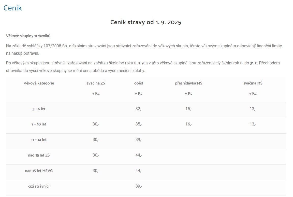 Ceny jídel (jídelna v ZŠ)